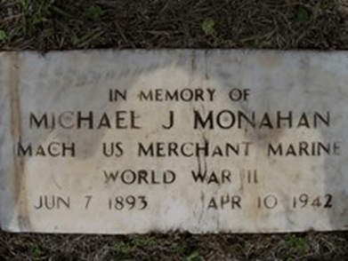 His curiosity piqued, Michael Grogan visited St. Lorenzo Cemetery, and found the grave, but no marker. He visited the funeral home, found the old death certificate, and wrote a short article about the grave with no tombstone. One of the members of the St. Johns River Chapter of the American Merchant Marine Veterans living in St. Augustine read the story and sent it to John Lockhart, a director of the St. Johns Chapter. John Lockhart researched and discovered that Michael James Monahan had been a machinist on the SS Gulf America.