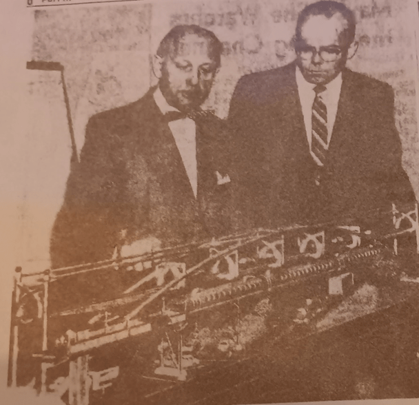 Jeff Morrell, Jerry Janco, and Matthew C. Bayer are three of the important main characters in Conneaut’s part in the monorail story, with the monorail itself being the perpetual main character. Jeff Morrell, President of the Conneaut Railroad Museum, donated a scale model of the Bayer Hi-Level Transportation System to the Conneaut Historical Museum. Jerry Janco, Museum Vice-President gladly accepted the model from the Railroad Museum. Matthew C. Bayer, created his prototype model and the documentation that arrived with imagination and perspiration.