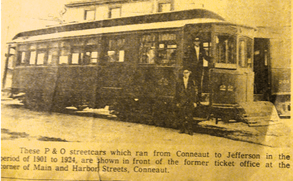 The P& O Line began operation in the fall of 1901 and continued until February 28, 1924. It connected with the Conneaut & Erie Railroad. Hourly service was maintained with the first westbound car leaving Conneaut in time to catch the last eastbound car arriving at Conneaut at midnight.